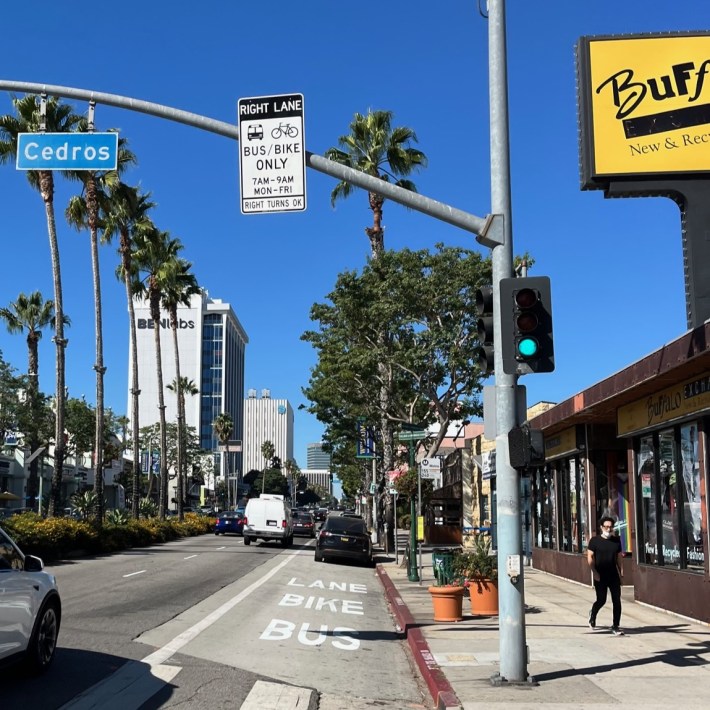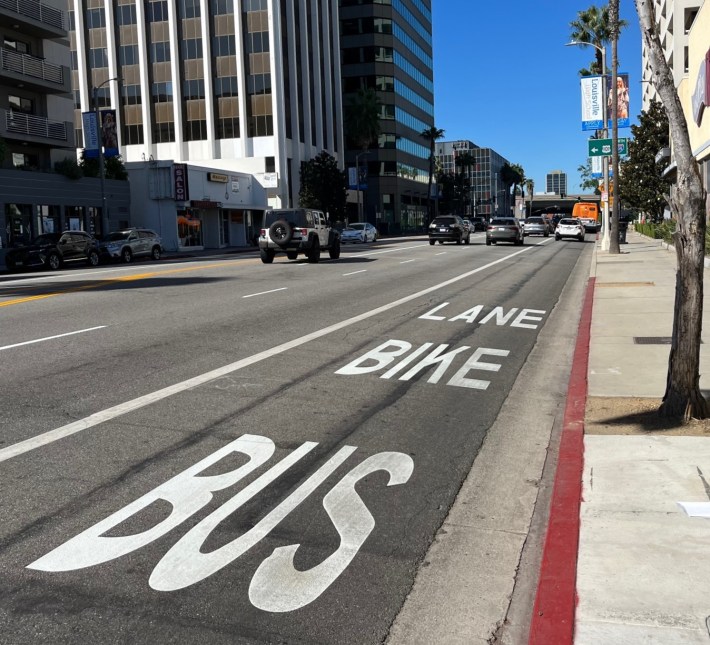 Both lanes are labeled “BUS BIKE LANE” so cyclists can ride there, but, like La Brea Avenue, they’re not a welcoming place to bike. The wording does make it clear to law enforcement that cyclists shouldn’t be ticketed for riding there. This past weekend, Streetsblog observed more drivers using the Sepulveda lanes illegally than cyclists using them legally. (Drivers are allowed in the bus lane to make right turns, but many proceed straight.)
