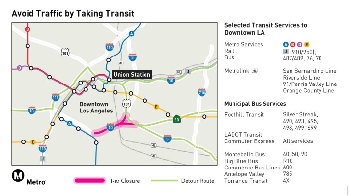 Some Metro and Metrolink lines roughly parallel other freeways that may be impacted by the closure of the 10 (none of these are exact parallels, and it’s a partial list – use Google Maps transit directions for more):