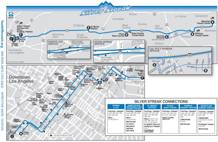 - Foothill Transit Silver Streak – East of downtown, Foothill Transit Silver Streak freeway express bus service runs on and along the 10 Freeway between Montclair and DTLA. Between El Monte and DTLA, riders can take either the Silver Streak or the overlapping Metro J (Silver) Line.