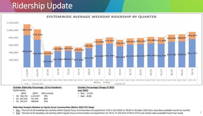 As of October, Metro transit ridership hit another pandemic-era high: 956,754 average weekday daily riders. That’s up from 938,000 in September.