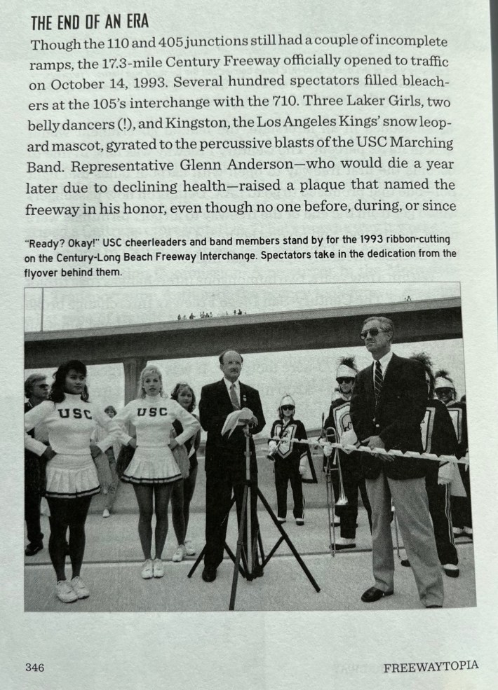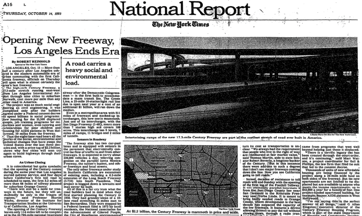 Freewaytopia, by Paul Haddad, quotes contemporaneous accounts of the 105 opening. Caltrans’ Jerry Baxter stated, “There probably won’t be another freeway built in an urban area… The cost is too high, and the environmental issues are still paramount.” Transportation expert Arthur Bauer asserted, “The Century Freeway is a magnificent study of sort of the end of an era and the beginning of another.”
