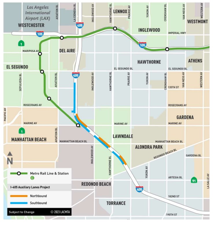 Metro is planning to spend an estimated $120+ million to add more lanes to the 405 Freeway between the 105 Freeway and Artesia Boulevard – through the cities of Hawthorne, Lawndale, Redondo Beach, and Torrance. In June, Metro approved $40 million for the project, announcing it would seek additional state and federal grant funding.