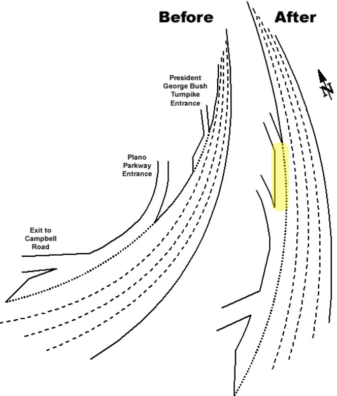 Below is a Federal Highway Administration diagram that shows configurations before and after an aux lane is added to a highway.