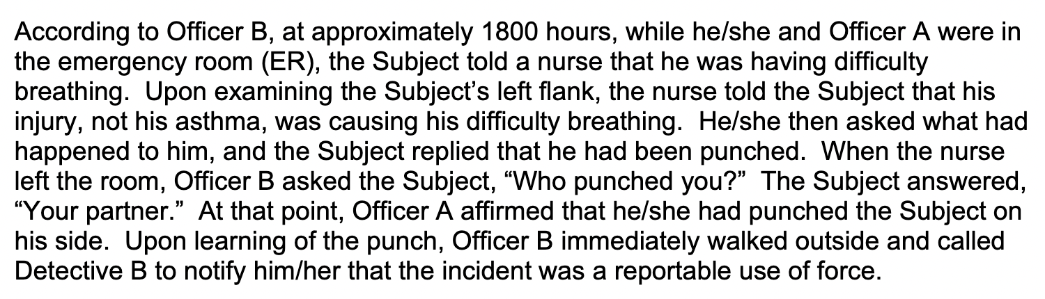 Although they quietly re-classified the punch as a “categorical” use of force in their findings (Moore had labeled it as “non-categorical” in his report, in line with the assertion that it was not the cause of Roots’ hospitalization), they did not otherwise challenge the department’s messaging. Which means they also accepted the implication that Roots was at fault for not having complained about being punched in front of the same officer who punched him.