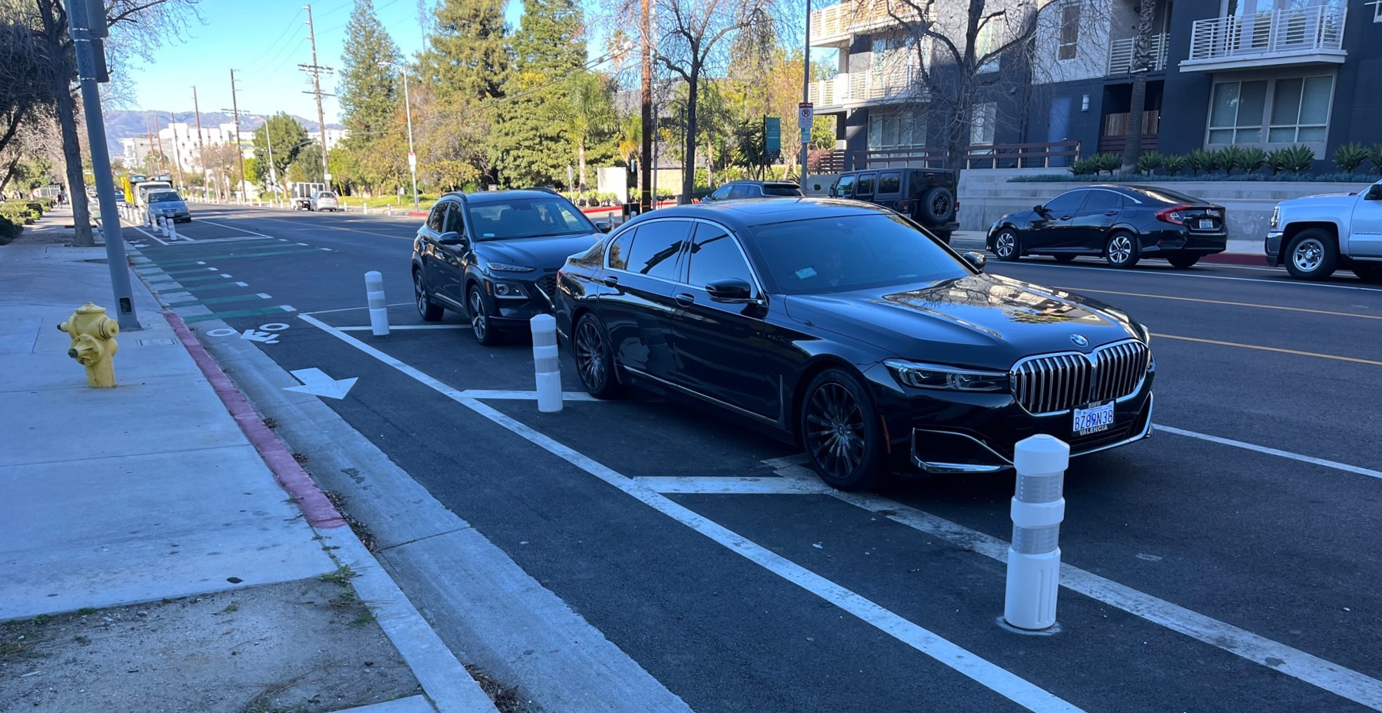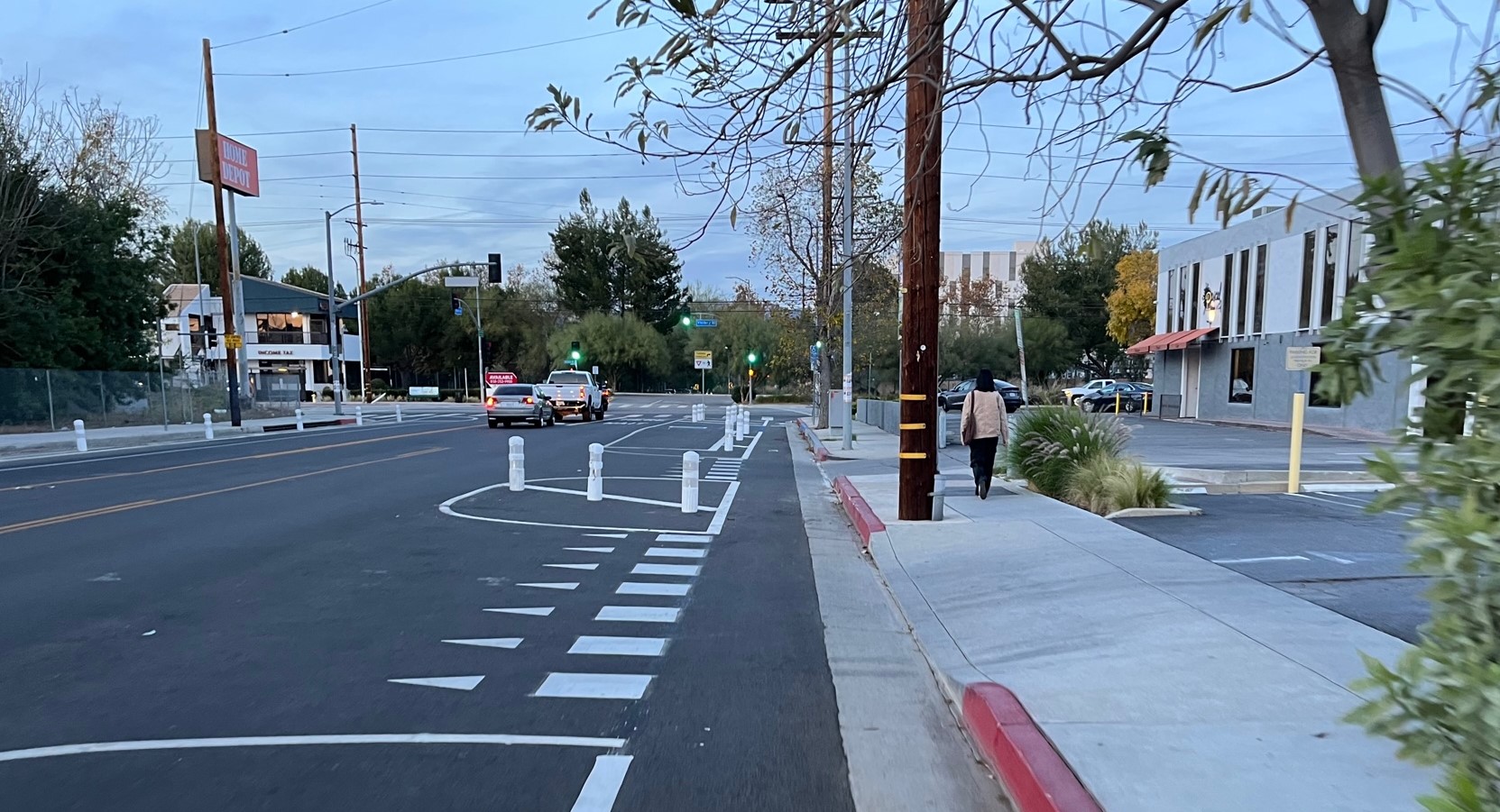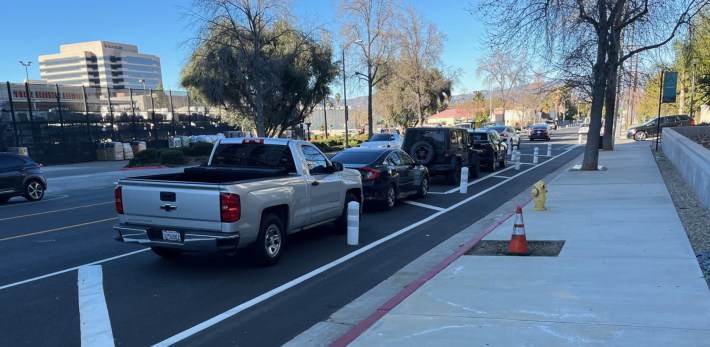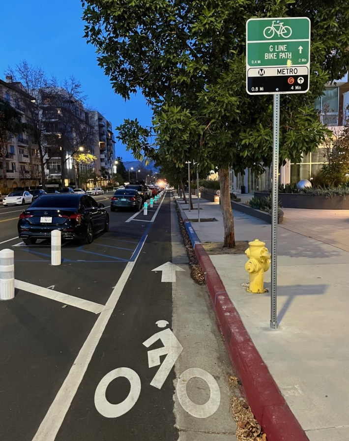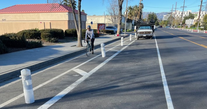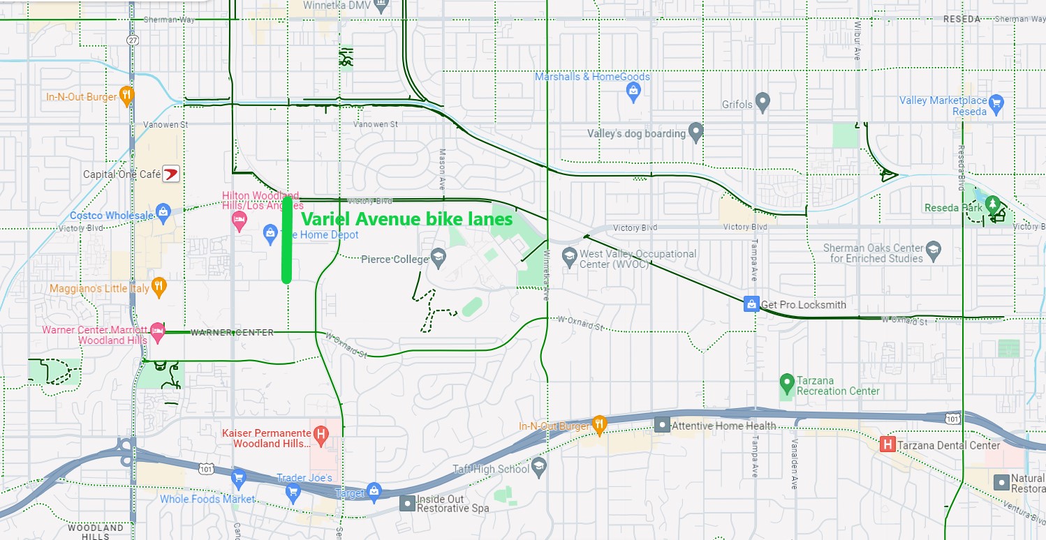 Last year, the city of L.A. Transportation Department (LADOT) added parking-protected bike lanes on Variel Avenue in the southwest San Fernando Valley community of Woodland Hills, represented by City Councilmember Bob Blumenfield. The bikeway connects an emerging residential area to the existing G Line bike path.
