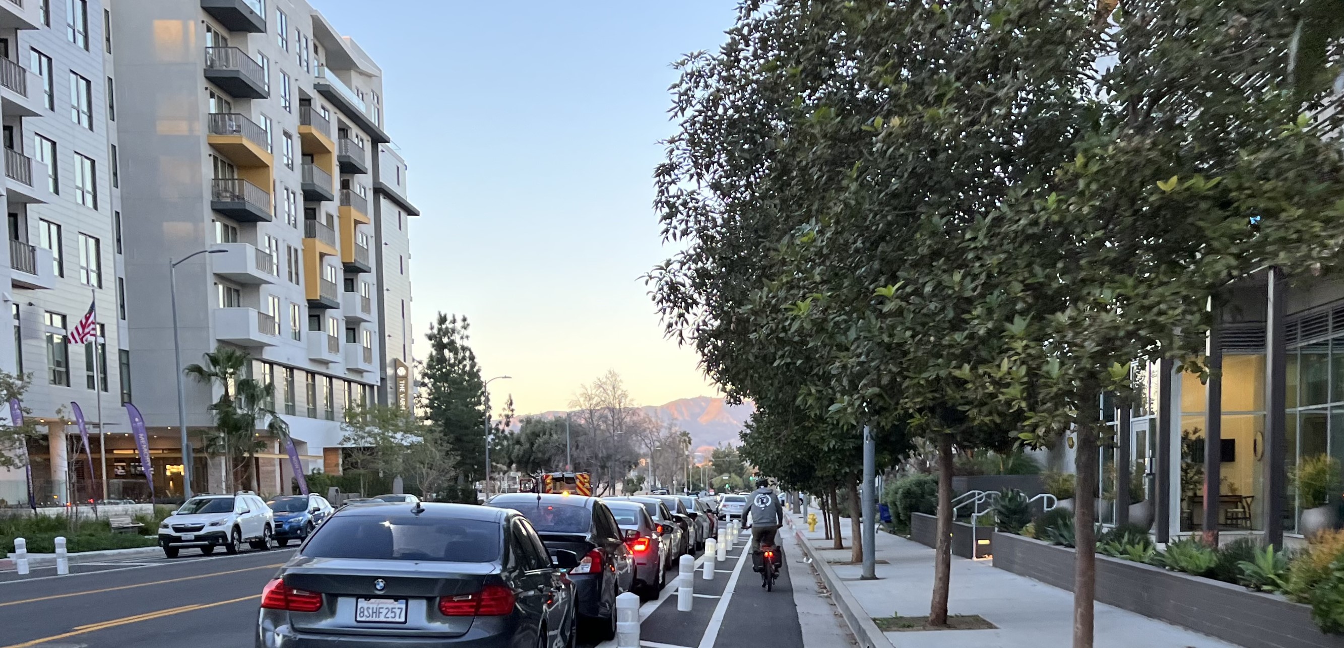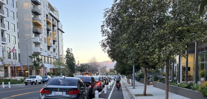 In keeping with the increasingly residential nature of the street, LADOT did a road diet, reducing four driving lanes to two. This freed space to add the protected bikeway.