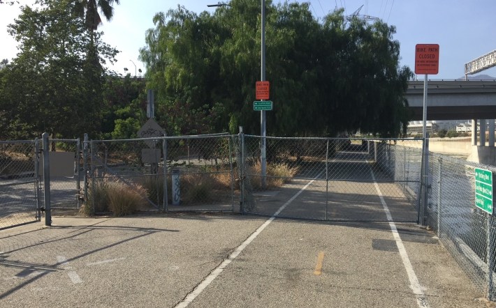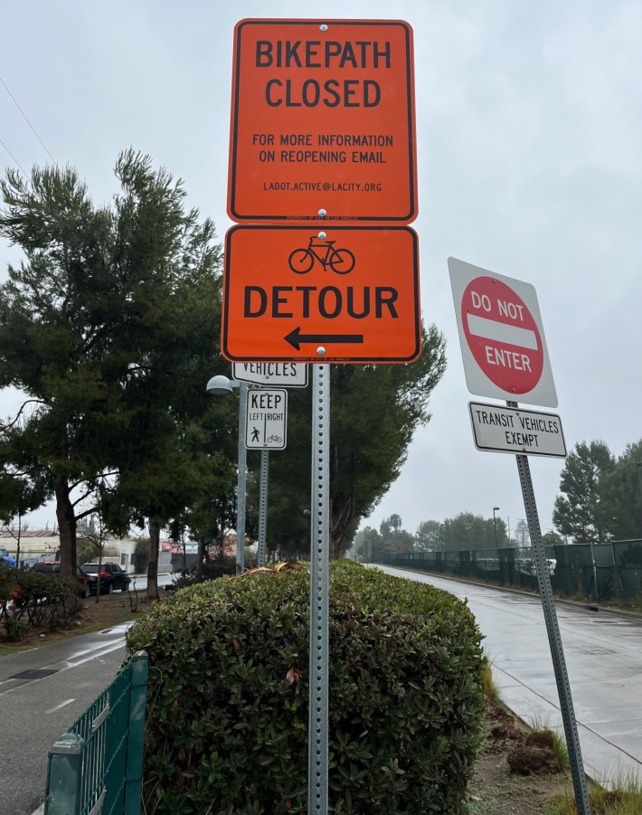 The city posted similar closure signage on the G (Orange) Line path in Van Nuys, which cyclists similarly ignore. (That path is newer; the asphalt appears to mostly be in decent shape.)