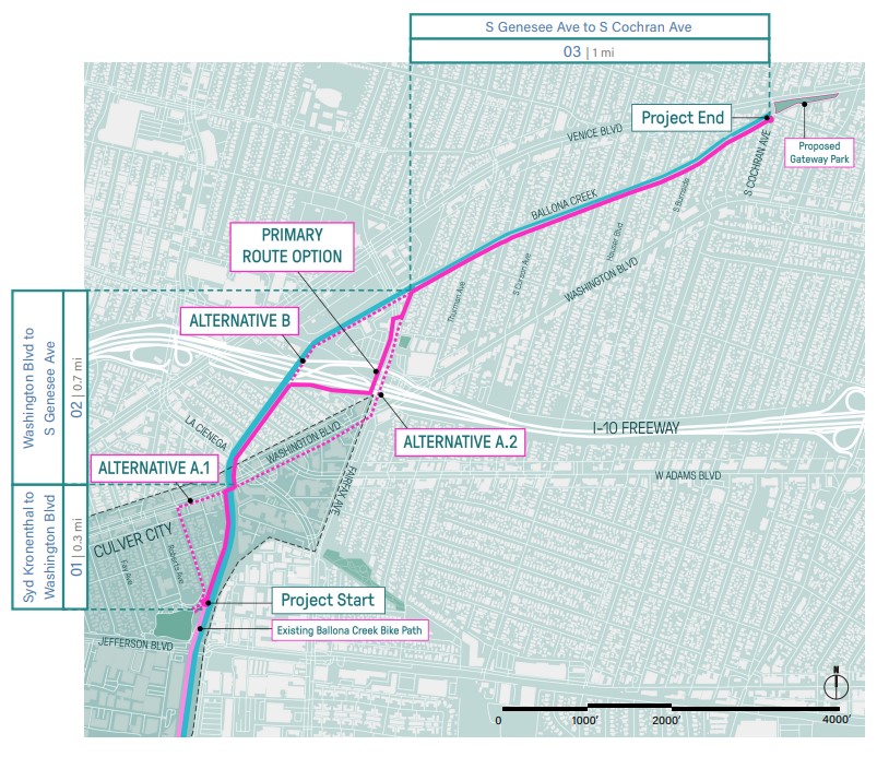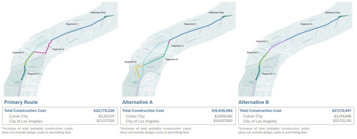 - Alternative A – The path would include more on-street segments in Culver City (Alternative A.1) and Los Angeles (A.2), which minimizes costs. Estimated cost $19.8 million.