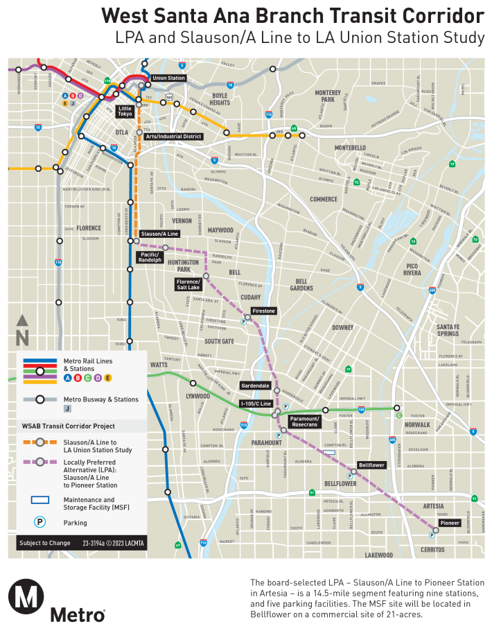 In 2022, Metro decided to proceed initially with a lower 9-station segment extending from the Slauson A Line Station to the city of Artesia. The remaining northern leg, from Slauson to downtown L.A. would be a built as a later phase.