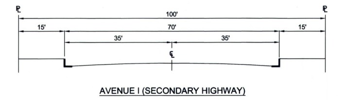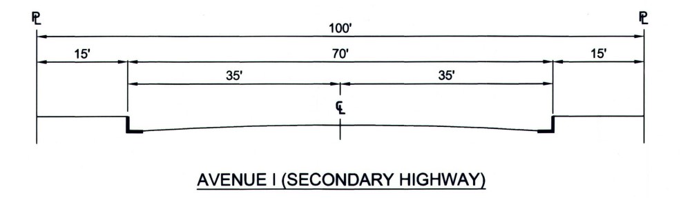 The city’s street standards show that an “Avenue I” street should have a 70-foot roadway and two 15-foot sidewalks.