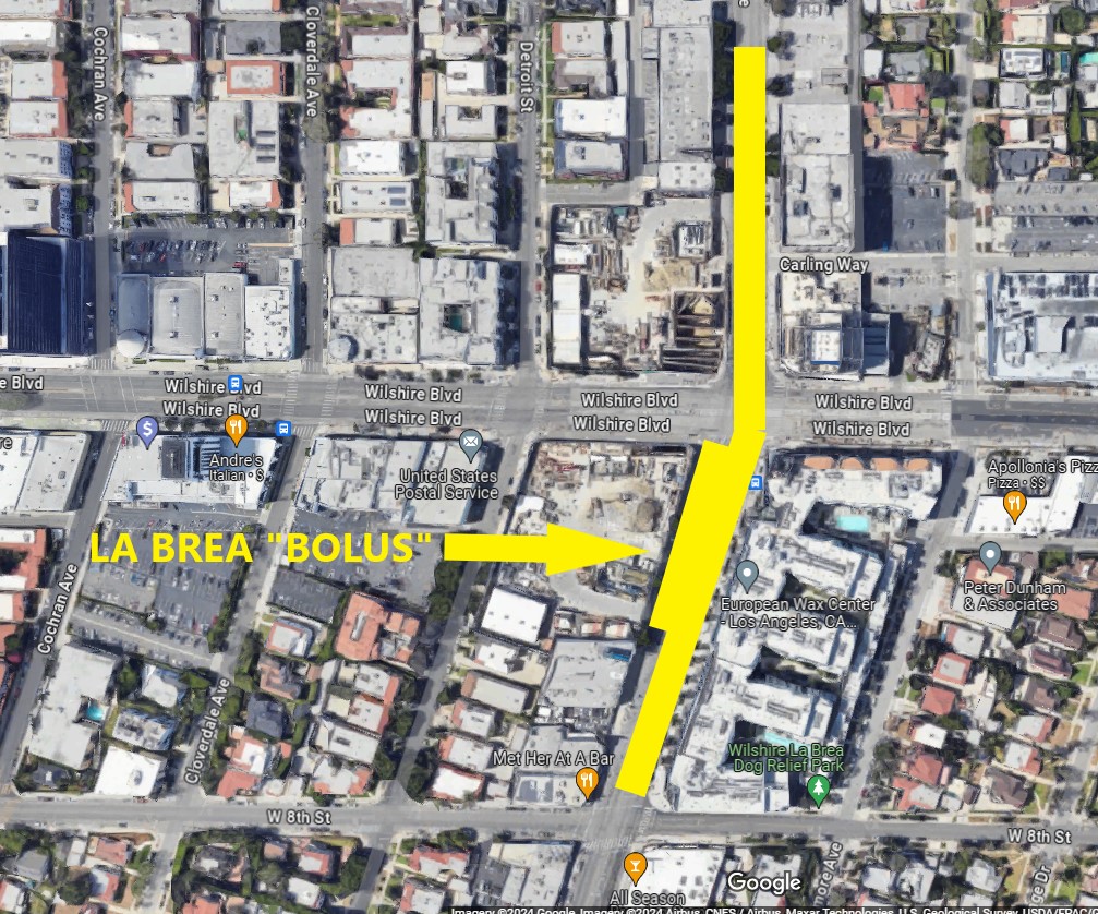 If there’s a place where roadway narrowing really makes sense it’s this part of La Brea, at the new station. In the past La Brea was widened for half a block south of Wilshire, across the street from the future Metro Station.