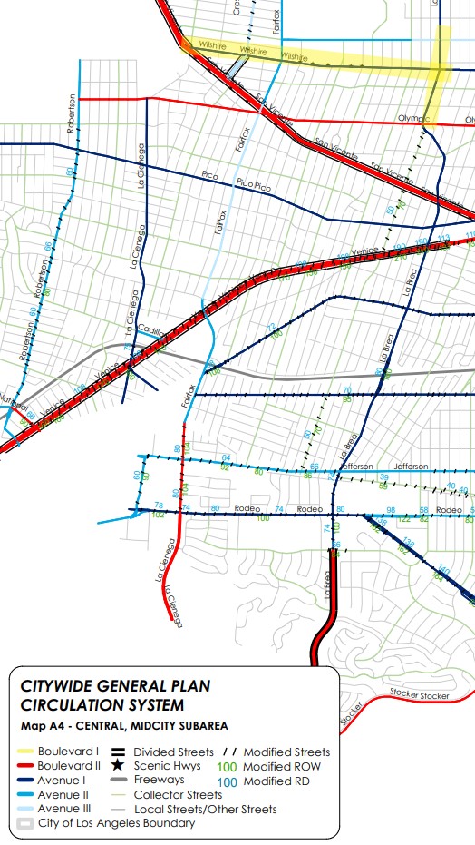 In the WPLE1 project area, the city Mobility Plan classifies both Wilshire and La Brea as “Avenue I” streets.