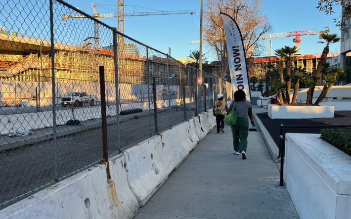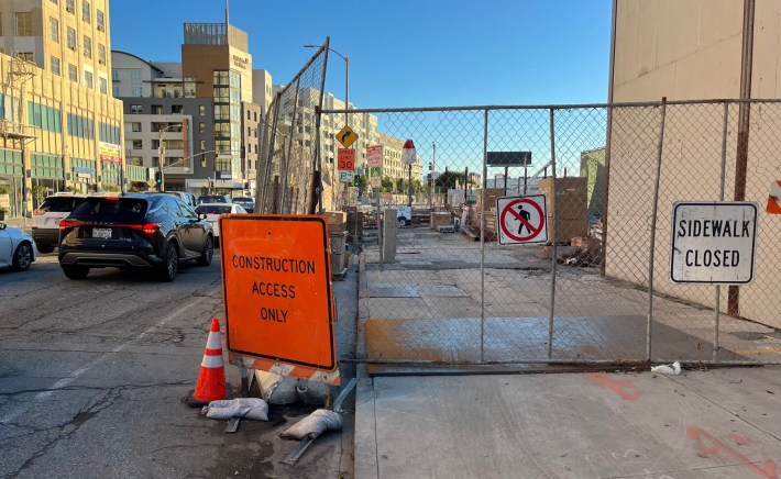 Metro WPLE1 street reconstruction on La Brea hadn’t started as of Tuesday. It’s not clear if Metro plans to widen or narrow La Brea, or to just re-do curbs at the existing width. Streetsblog asked Metro, LADOT, and BOE what the plans are for those two blocks, and no information was available at press time.