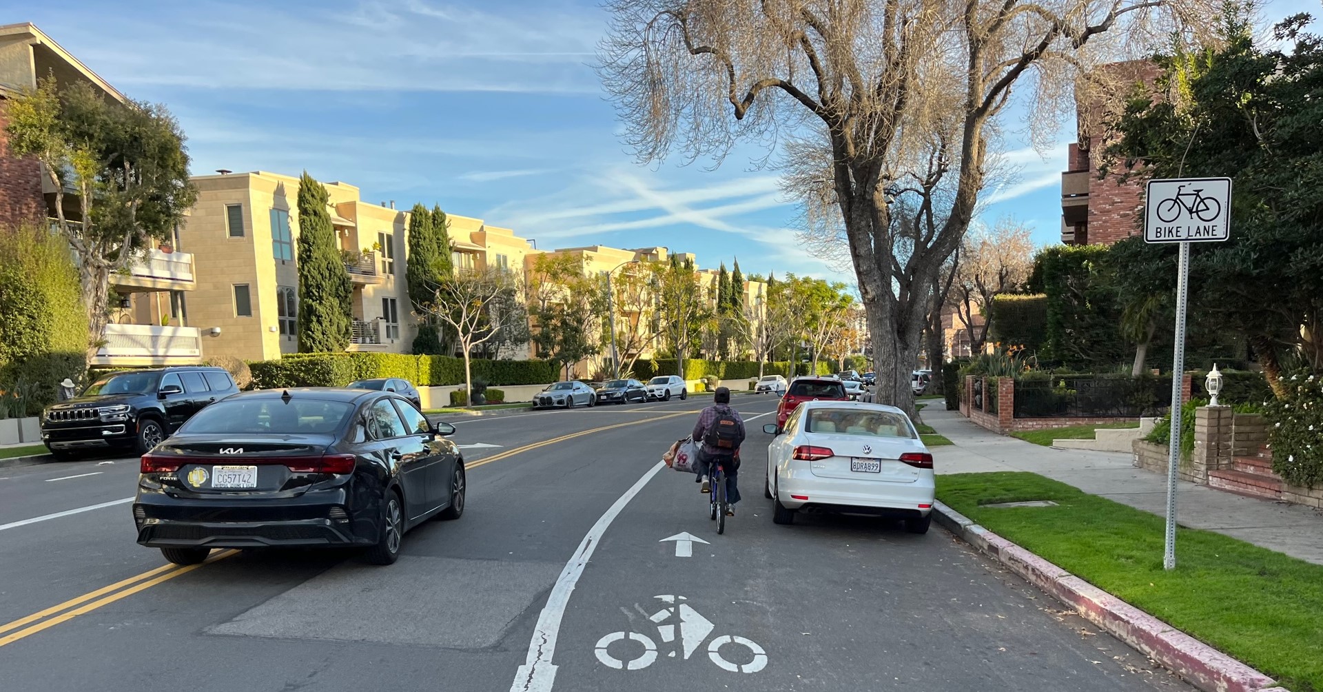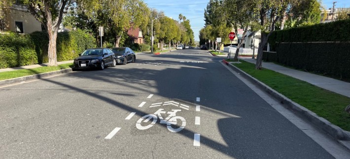 Beverly Hills’ short Roxbury bikeway extends adjacent unprotected lanes on Roxbury in the city of Los Angeles.