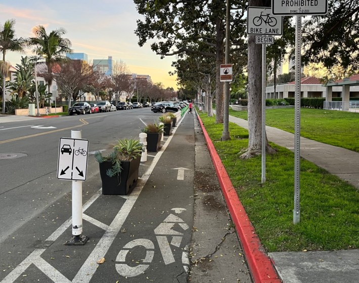 (One frustrating thing I noticed is how this protected block of Roxbury contrasts with Neptune Avenue in the L.A. City neighborhood of Wilmington. When L.A. added diagonal parking to 56-foot wide Neptune Avenue, the city removed a bike lane, claiming it would not fit. On 54-foot wide Roxbury, the city of Beverly Hills managed to fit all the same features – two travel lanes, two sides on-street parking with one side diagonal – and included a protected bike lane. Maybe L.A. could learn a lesson from Beverly Hills, and rework Neptune to add the bike lane back?)