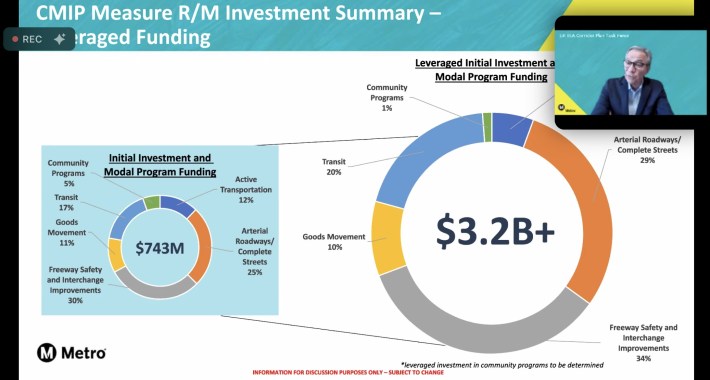 The main tranches of funding would go to freeway/ramp/road expansion: “Freeway Safety and Interchange Improvements,” plus Goods Movement and Arterial Roadways/Complete Streets (again, past performance shows that Metro has consistently emphasized the roadway part, resisting the non-car-centric components except as a sort of de minimis fig leaf tacked on).