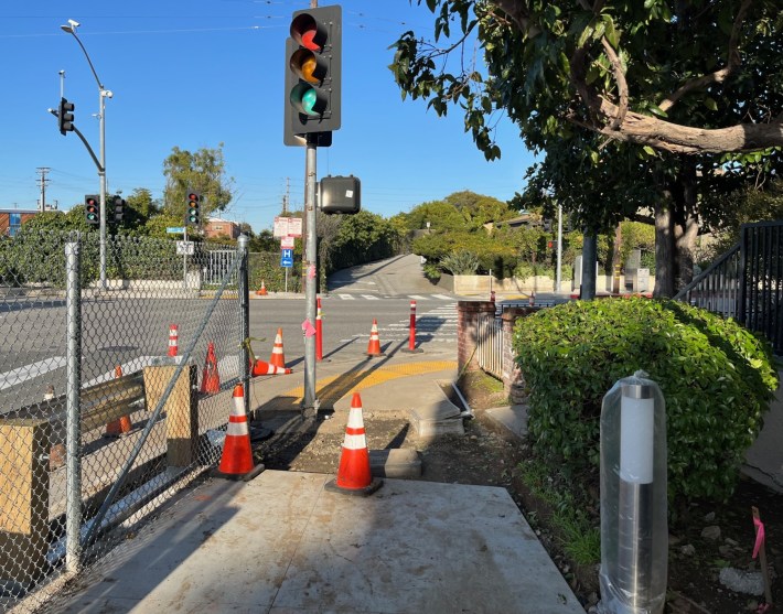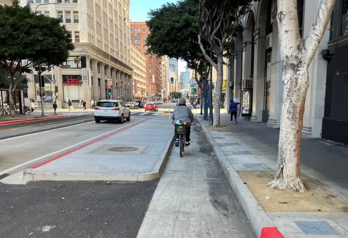 Since 2022, the city of L.A. has been building its wonderful 7th Street Streetscape project. The project includes the city’s first extended stretch of concrete curb-protected bike lanes and protected intersections.