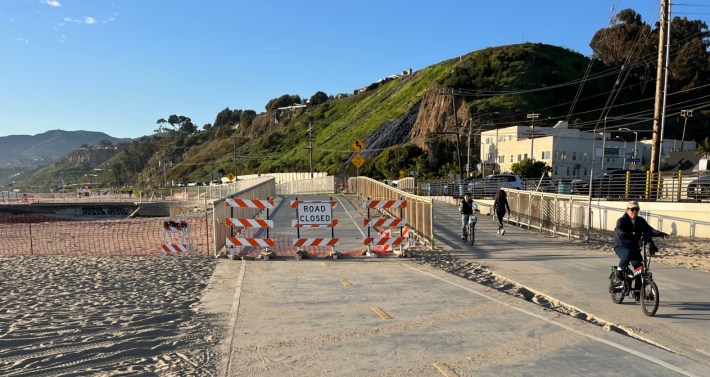 Early last month, L.A. County Department of Public Works Twitter and KTLA reported that a section of the popular beach bike path collapsed due to damage from heavy rains. The impacted section is located at the mouth of Rustic Creek in the L.A. City neighborhood of Pacific Palisades, just northwest of Santa Monica. Nearby cross streets are Channel Road, Entrada Drive, and Chautauqua Boulevard.