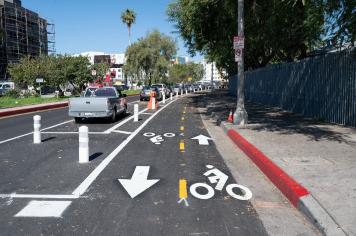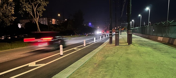 The Imperial bike lanes are a too-modest improvement at a fairly high cost (2,000 feet of new lane-miles for $1.9 million), so cyclists have been critical of the project. The lane is narrow. The protection is flimsy. The sidewalk ends in the middle of nowhere. Drivers there regularly speed to and from the nearby 105 Freeway terminus.