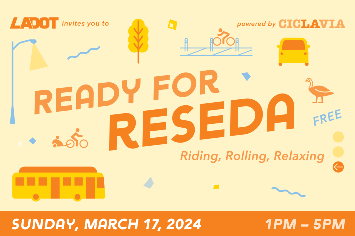 - Sunday 3/17 – From 1-5 p.m. CicLAvia and the L.A. City Transportation Department (LADOT) will host Ready for Reseda. The free family-friendly event will celebrate the recently completed three-mile long Reseda Boulevard Complete Streets Project which features bike/walk/transit upgrades, new sidewalk rain gardens, and more – on Reseda between Parthenia Street and Victory Boulevard (about a half-mile north of the G Line busway/bikeway Reseda Boulevard Station). The event is not a CicLAvia open streets festival; Reseda Boulevard will remain open to cars. Ready for Reseda will feature two activity hubs – at the north end of Reseda Park and at Reseda and Saticoy – with music, street games, bike rentals, group rides, free pedicab rides, food trucks, freebies, art workshops and more activities for all ages and abilities. Drop in from 1-5 p.m. on Reseda Boulevard. Details at CicLAvia event page.