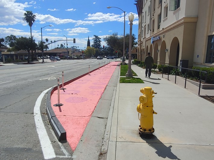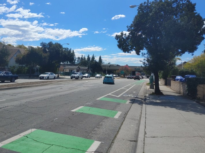 The new bike lanes connect Allen Station to the nearby bike lanes on Villa Street. Currently though, only the northbound side of the 210 Freeway underpass has a bike lane. The southbound side, where the Allen Station drop off zone is located, has sharrows.