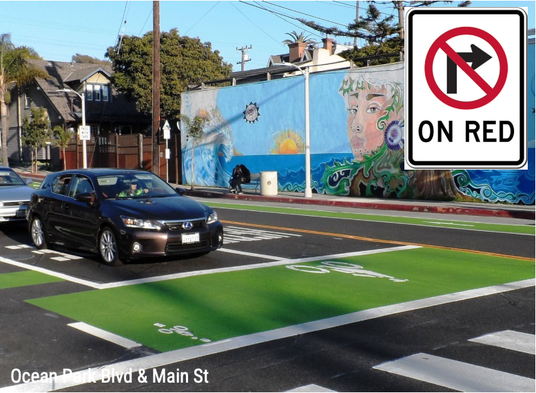 The project will modify the northeast corner of Olympic Blvd and 26th St to remove the channelized right turn or slip lane. This will reduce speeds for turning vehicles and improve sightlines.