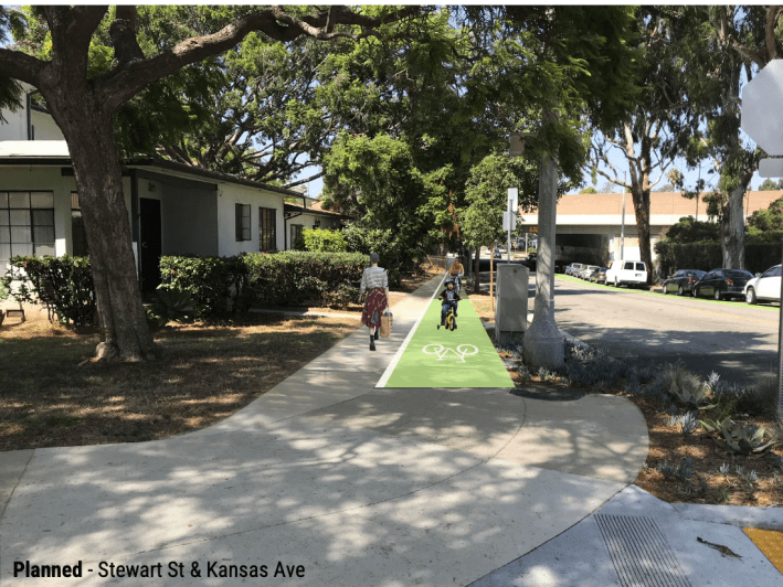 A short section (240 feet) of the bike facility from the 10 Freeway underpass to Kansas Ave will be raised to sidewalk level. The 8’ bikeway will contain signage and bike markings to clarify the space allocated for bicyclists and scooters. The project terminates at Kansas Ave, leading users to nearby schools and parks.