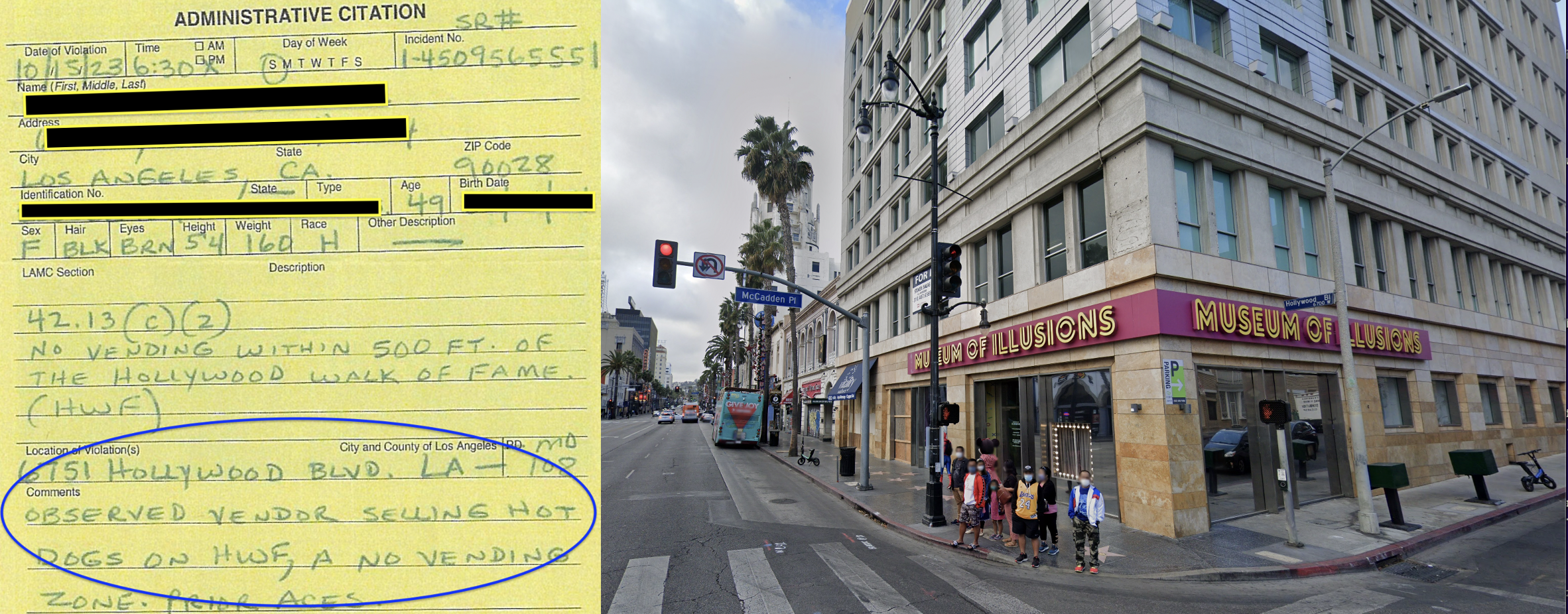 The restrictions hit vendors along Hollywood Blvd. particularly hard, banishing them not just from the boulevard between La Brea and Vine (and along several blocks of Vine), but from surrounding side streets as well. Enforcement was also particularly oppressive there. In a March 2023 statement, plaintiff Monroy – who had worked along the boulevard for several years before the restrictions were put in place – said she had been cited for her mere presence, including “as I’ve walked with my family on Hollywood Boulevard on my days off.” In the lawsuit, plaintiff Alvarado said she had once received two separate tickets in the mail purporting to be from the same day. On another occasion, she said, she had been wrongly ticketed for vending within 500 feet of the no-vending zone (which already included the 500′ buffer).
