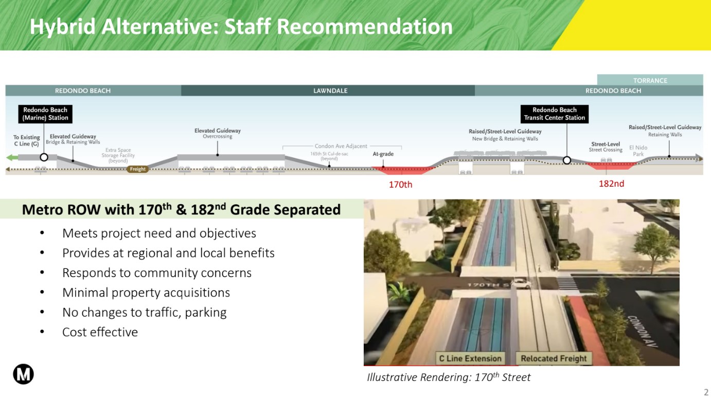As shown in the above image, the selected hybrid alternative cost is relatively low ($2.2 billion) compared to a full trench ($2.8 billion) or Hawthorne Boulevard ($3 billion). The hybrid costs more than Metro’s mostly at-grade alignment ($1.9 billion); for that added cost, it adds two grade separations, which improve safety, travel time, and reliability.