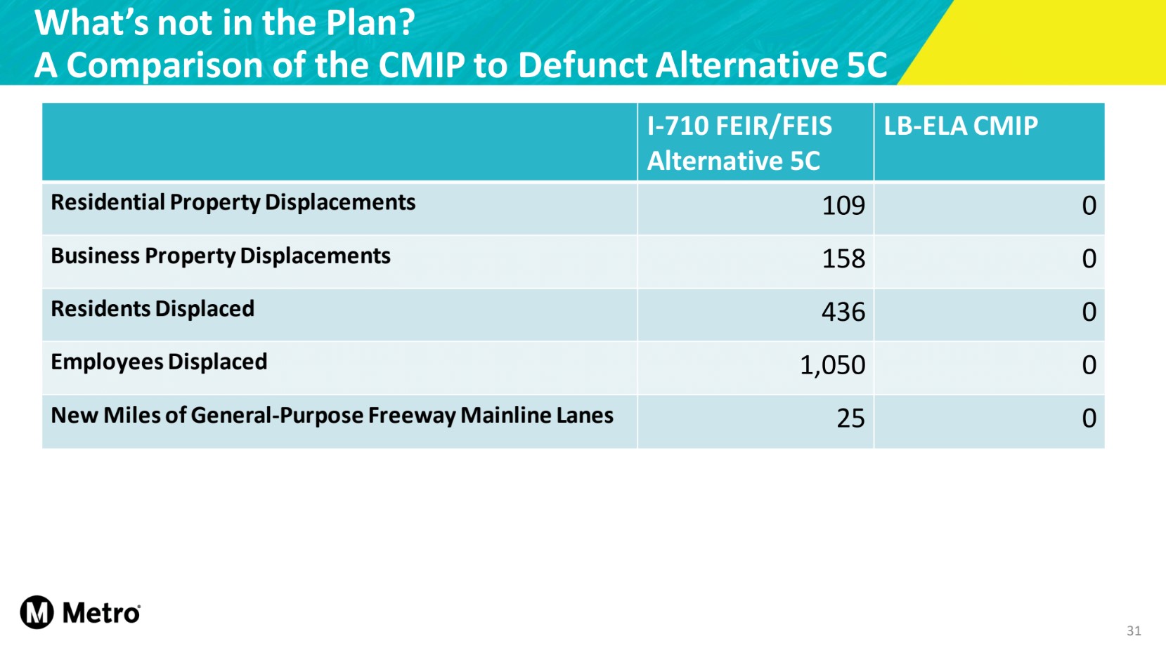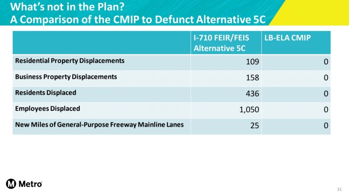 In a late February presentation to its 710 corridor task force, Metro shared a chart (above) that showed that its current 710 widening plan would have zero displacements of residential or business properties.