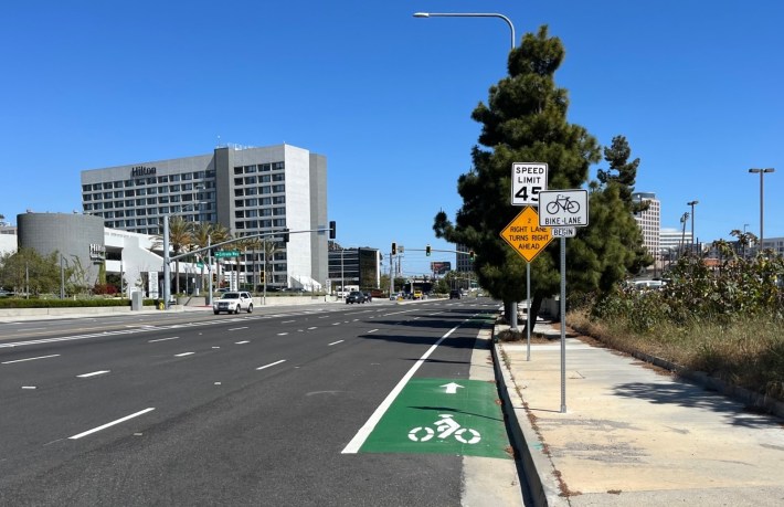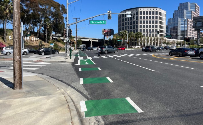 The new Centinela lanes are a welcome safety upgrade for a stretch that long lacked any type of bikeway, but the area remains not all that bike-friendly; it is still wide streets, choked with lots of car traffic spilling onto and off the adjacent 13-lane-wide 405 Freeway and the nearby six-lane 91 Freeway.