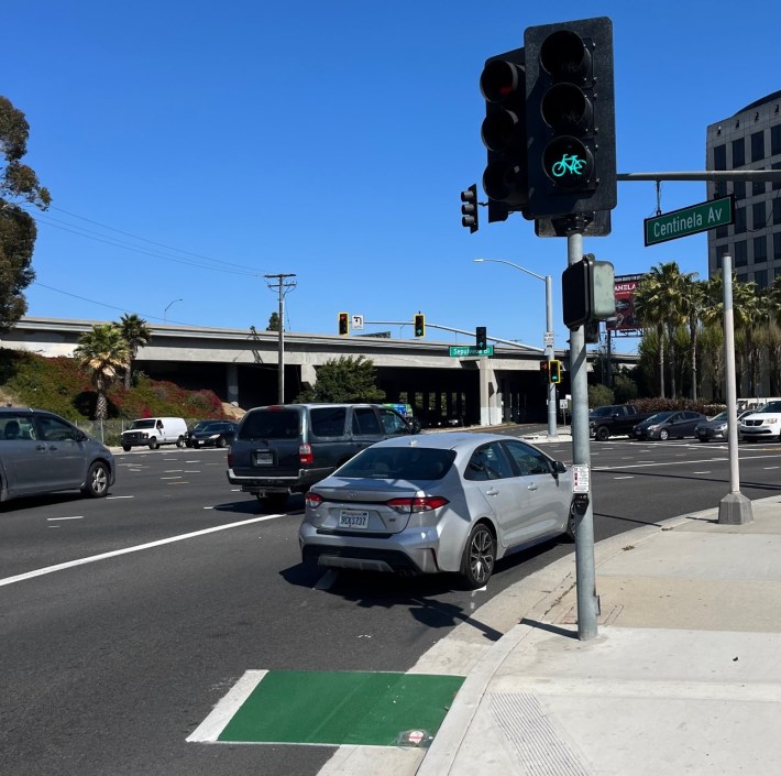 The bike signal, uncommon in Southern California, was added soon after. The signal gives cyclists their own phase at the busy intersection of Centinela and Sepulveda Boulevard (where drivers have two right turn only lanes).
