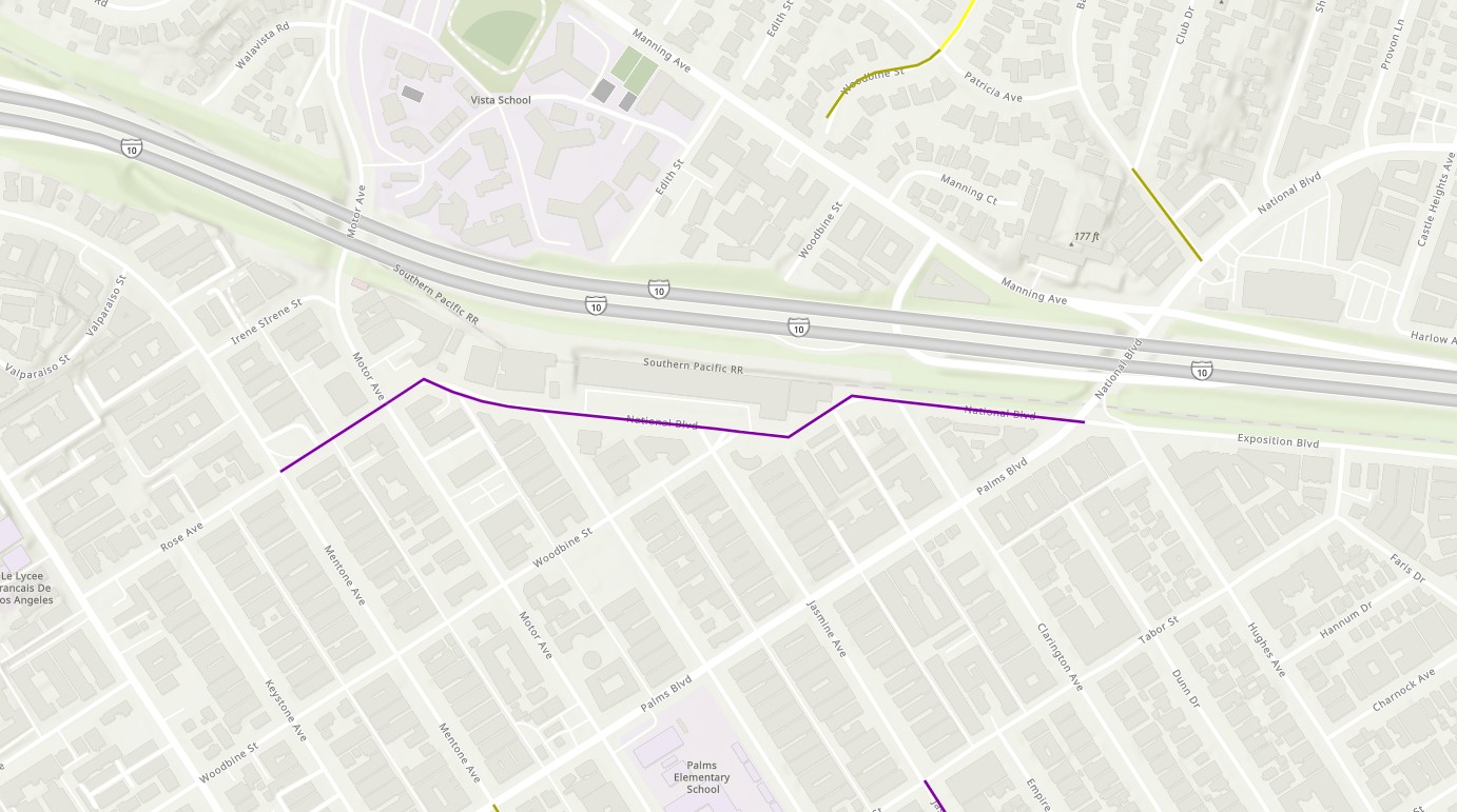 StreetsLA’s online repaving map shows, for Fiscal Year 2023-24, a planned half-mile repaving of National from Palms Boulevard to Mentone Avenue – just west of the Metro E Line Palms Station. MP2035 designated this street to receive bikeway upgrades: existing unprotected bike lanes would become protected lanes. (MP2035 also designates this part of National as a Pedestrian Enhanced District, and the city did install new sidewalks where there had been a gap.)