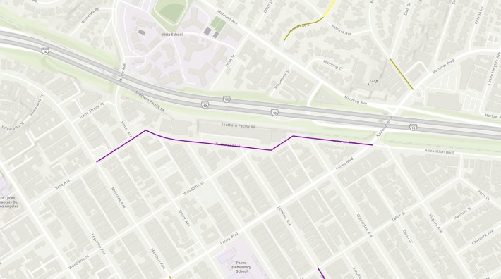 Starting in late April, StreetsLA repaved parts of National Boulevard, but instead of the full half-mile, the repaving project was only about a tenth of a mile (between Woodbine Street and Clarington Avenue), short of the 1/8-mile trigger.