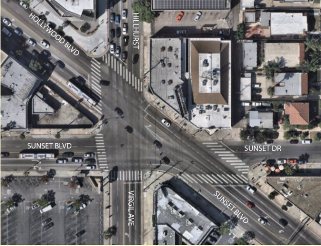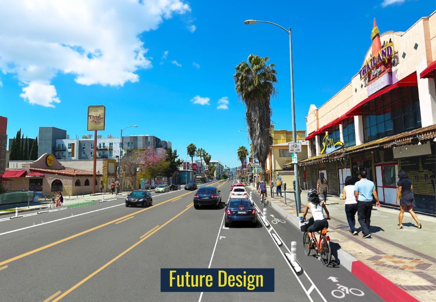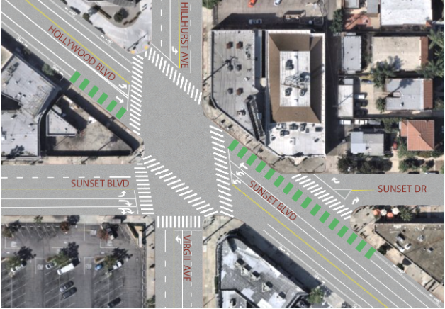 A second phase – about a quarter-mile from from Lyman Place to Fountain Avenue – will be installed “at a later date.” That second phase will extend the protected bikeway through the six-way intersection at Sunset Boulevard, Virgil Avenue, and Hillhurst Avenue.
