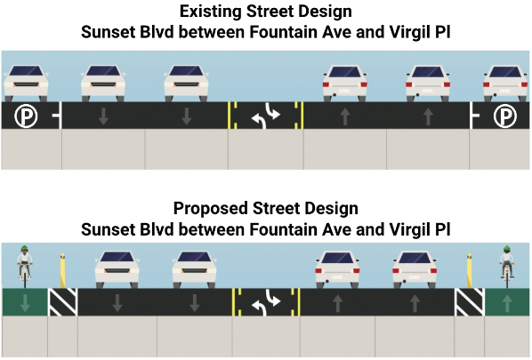 The short later segment designs are still being finalized, but LADOT notes that the current plan is to remove a block of on-street parking on Sunset between Virgil/Hillhurst and Fountain.