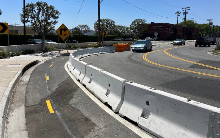 Mostly the bikeway is protected by soft-hit posts, but at the elbow where Front turns onto Verdugo Avenue, the protection is concrete jersey barriers.