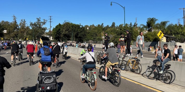 Most SBLA readers are familiar with Arroyo Fest, but just in case: last year, ActiveSGV partnered with Caltrans, Metro, the San Gabriel Valley Council of Governments, and the cities of L.A. and South Pasadena to temporarily close seven miles of the 110 Freeway to cars – and open it to about 50,000 people on bike, foot, skates, and scooters.