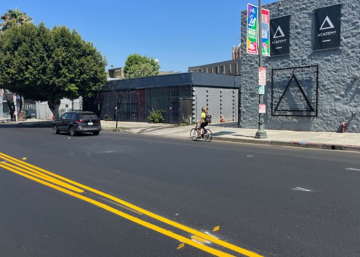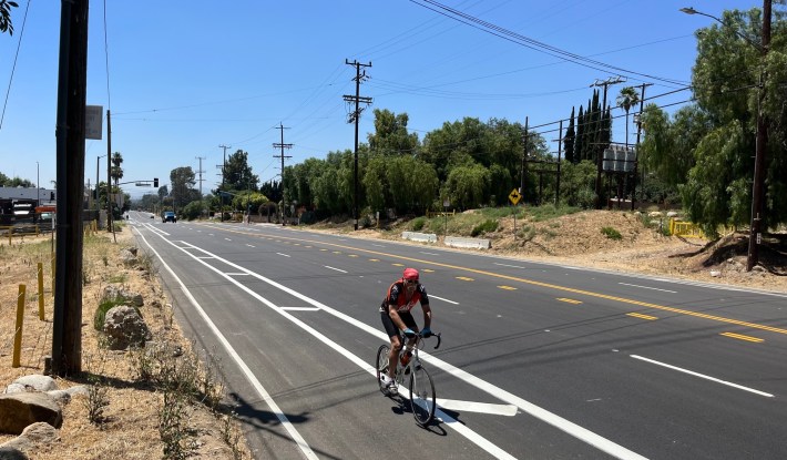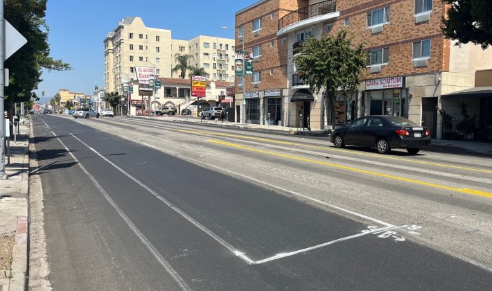 Just before Measure HLA took effect in April, the city resurfaced Foothill Boulevard from Christy Avenue to Esko Avenue in Lake View Terrace – adding new buffered bike lanes between Wheatland Avenue and Christy. The project should help to slow drivers at the site of a horrific 2019 hit-and-run car crash that killed two horses and critically injured their riders.