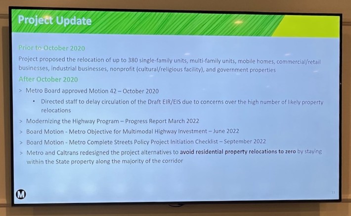 In 2023, Metro staff announced that the 605CIP would have “no residential displacements” which was a massive reversal of the hundreds of homes and apartment building demolitions Metro announced in 2020. But last night Metro seemed to be slightly backing off its no demolitions pledge with qualified statements including “some partial acquisitions might be needed, but no residential relocations are required” and a confusing (or typo) assertion that Metro and Caltrans will “avoid residential property relocations to zero.”