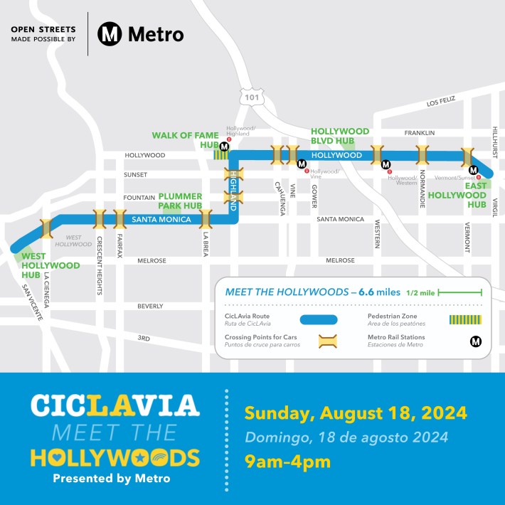 A month from now, CicLAvia will open 6.6 miles of streets through West Hollywood, Hollywood, and East Hollywood. The event will include an extended stretch of Hollywood Boulevard – including the Walk of Fame – plus portions of Santa Monica Boulevard and Highland Avenue.