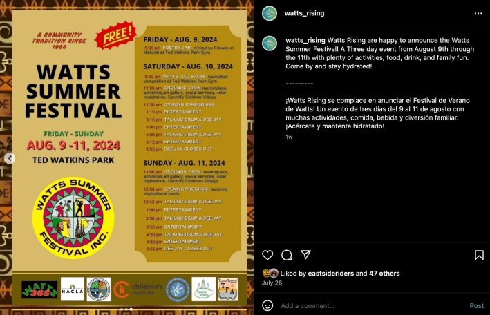 - Friday 8/9 – Sunday 8/11 – The Watts Summer Festival at Ted Watkins Park. Things kick off Friday afternoon with a 5 p.m. poetry reading hosted by Friends at Mafundi in the gym at Ted Watkins Park. The rest of the event runs through the weekend, starting with a 9 a.m. basketball competition Saturday morning and a marketplace opening on Sunday at 11 a.m. The event is free and is an open house for Watts Rising, a collaborative formed through the award of a Transformative Climate Communities (TCC) grant from the State of California’s Strategic Growth Council.