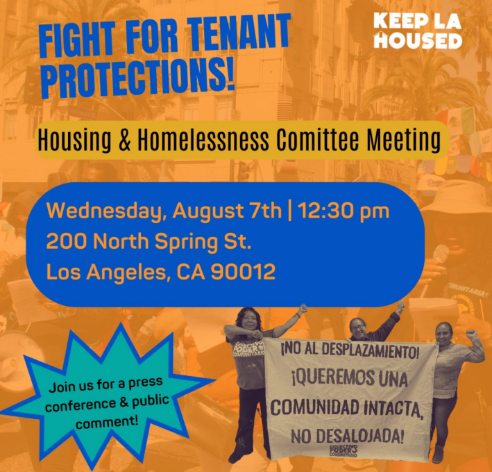 - Wednesday 8/7 – Tenants, advocates, and housing justice organizations & coalitions plan to rally outside L.A. City Hall ahead of Council’s Housing & Homelessness Cmte meeting to demand urgency around a suite of policies affecting renters – some which will be on the agenda, and others that they say have been stalled for too long. The rally begins at 12:30 p.m. Learn more about the proposed Tenant Bill of Rights here. The committee meeting begins at 2:30 p.m. See the agenda for details.