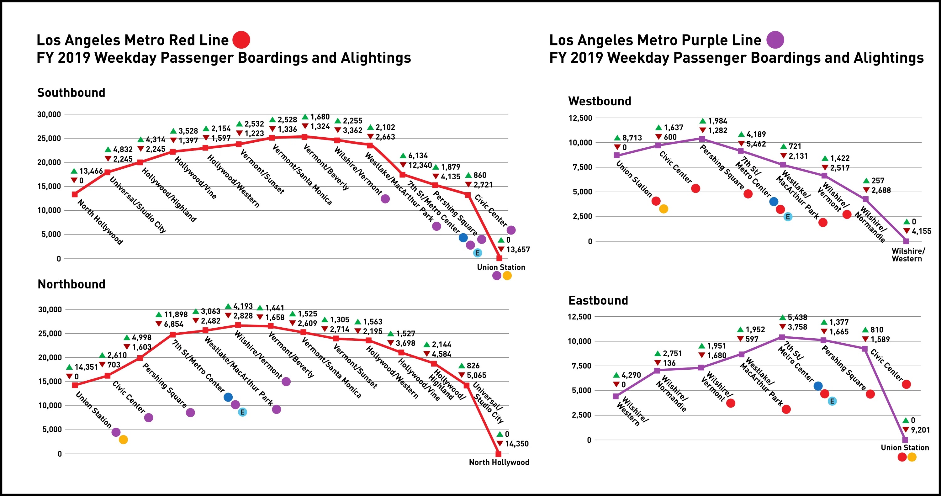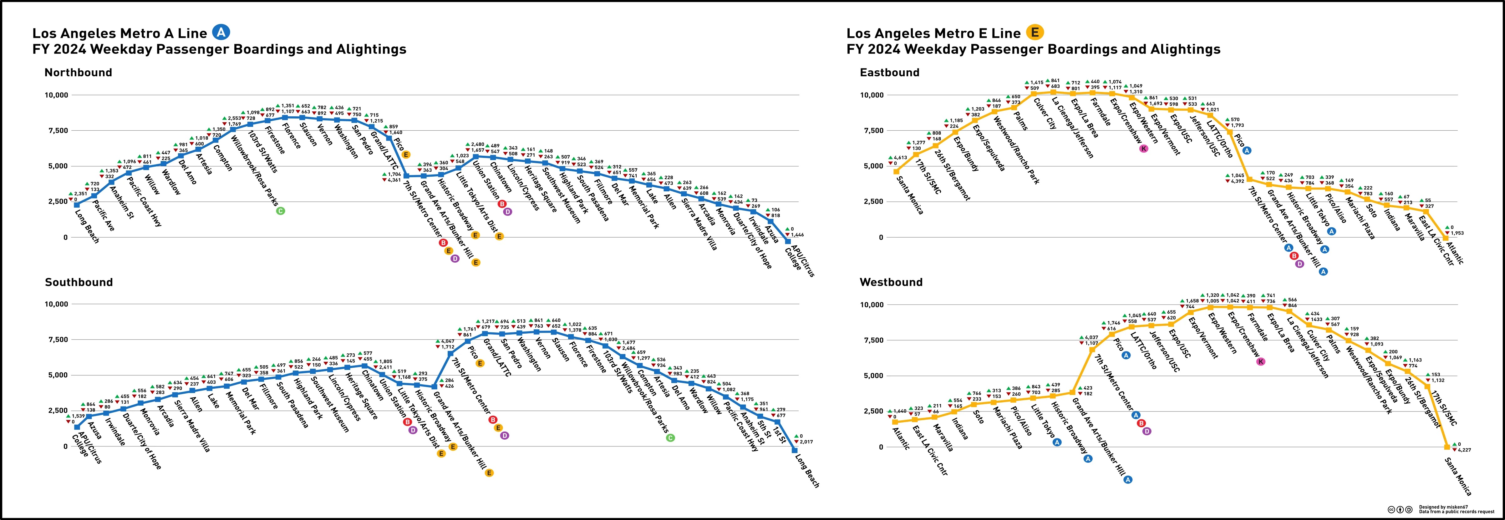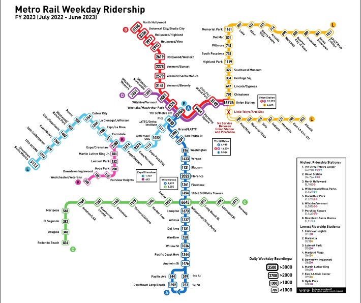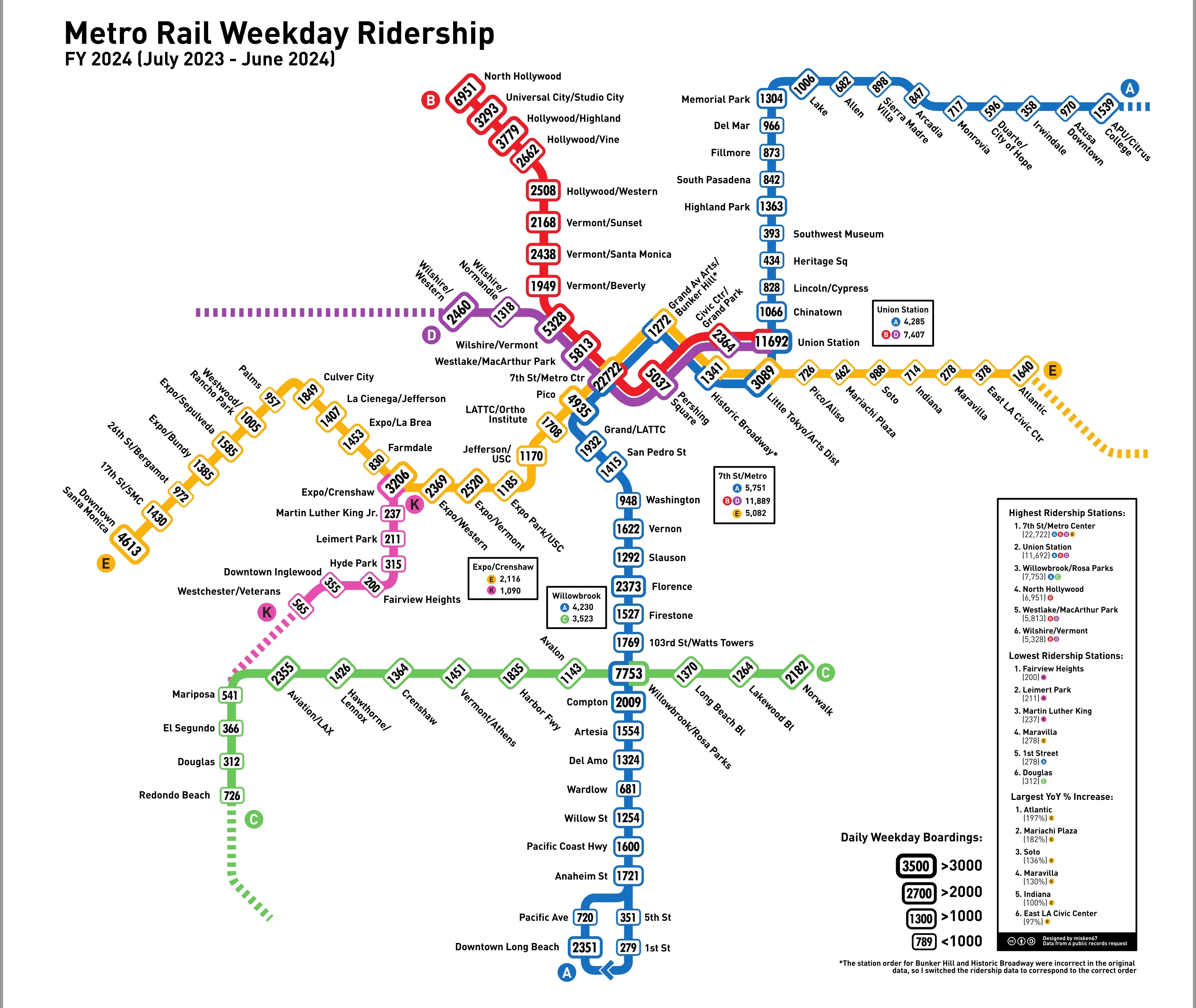 New infrastructure (Regional Connector and K Line) are doing great. Strong post-covid recovery in general, and particularly strong recovery for stations affected by closures in previous years. Few light rail stations lost ridership, but nearly all heavy rail stations did. 7th/Metro Center is a beast.