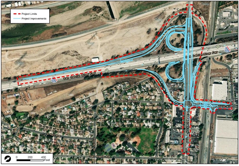 Temple Avenue: Southbound Temple would be widened from two to three lanes (basically extending the current pocket where drivers enter the 605 onramp). The at-grade railroad crossing would have pedestrian safety gates installed.