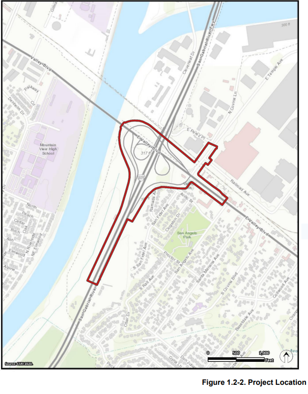 Eastbound Valley Boulevard: Where the current southbound off-ramp ends (before the freeway underpass), the intersection would be signalized. The northbound onramp (on the other side of the bridge) functions similar to the current design, though the project would add a dedicated right turn pocket. A widened shoulder here theoretically would provide for a future bike lane not included in the project.