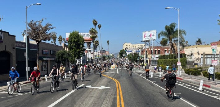 Similar to events in 2022 and 2019, the route featured Hollywood Boulevard, Santa Monica Boulevard and Highland Avenue. One new feature along the route was Hollywood Boulevard’s two new miles of parking-protected bike lanes, though there wasn’t any car parking and cyclists didn’t need to be restricted to just one narrow lane.