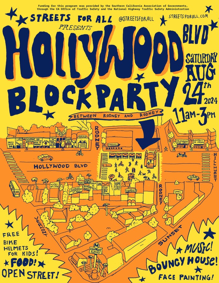 - Saturday 8/24 – Streets for All and the Los Feliz and East Hollywood Neighborhood Councils will host a Hollywood Boulevard Block Party from 11 a.m. to 3 p.m. on Hollywood Boulevard between its north and south intersections with Rodney Drive (just east of Vermont Aveue). The free open streets event will feature music, food, shopping, bouncy house, and more. Details at SFA event page.