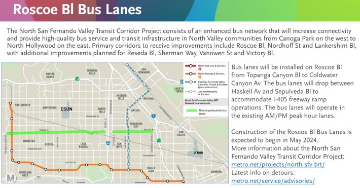The new Roscoe bus lanes are part of Metro’s North San Fernando Valley Transit Corridor project, which got under construction in May. The NSFV project includes the Roscoe bus lanes, increased weekday bus service (which started in June), and numerous bus hub/stop/shelter upgrades underway. Find project details at earlier SBLA coverage or Metro’s project page.