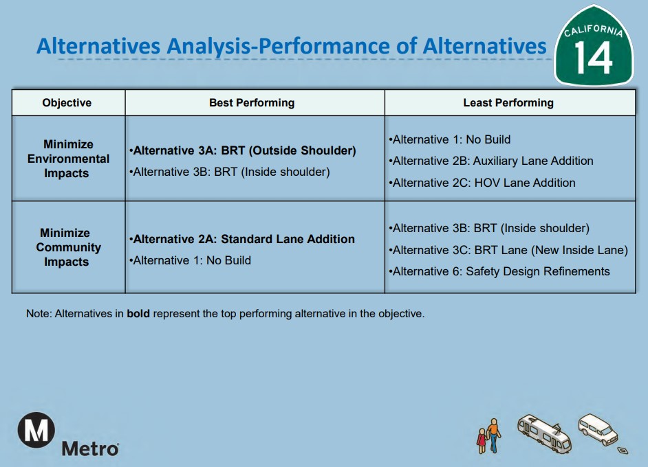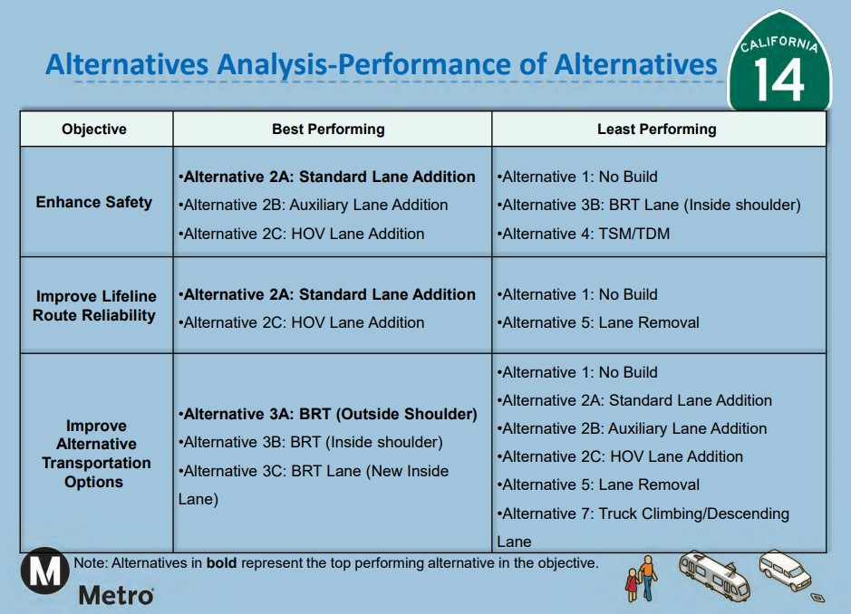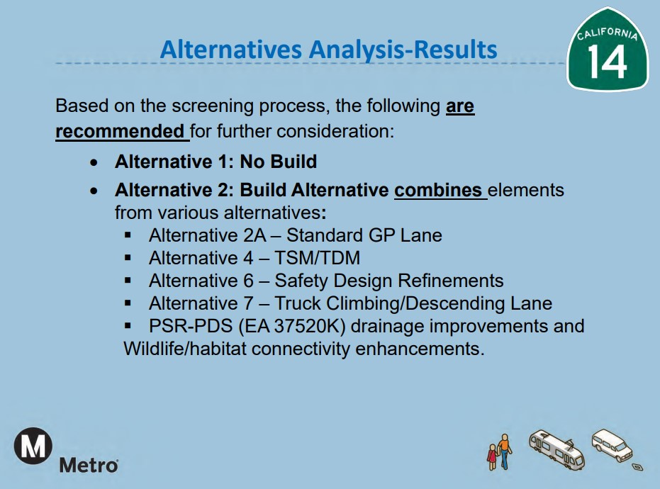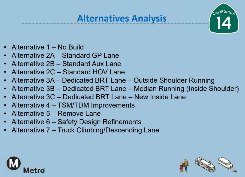 Metro recently presented the alternatives they studied for the 14 Freeway corridor; this gives an indication of what features are likely to be part of the project as it moves into environmental studies and approvals.